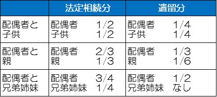 なお、法定相続分と遺留分の関係は以下の表のとおりです。