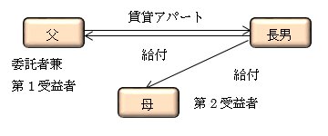例えば、賃貸アパートのオーナー(委託者兼受益者)が息子(受託者)に「自分に代わってアパートを管理し、家賃から必要諸経費を差し引いて自分に給付してくれ。」と依頼(信託契約)します。